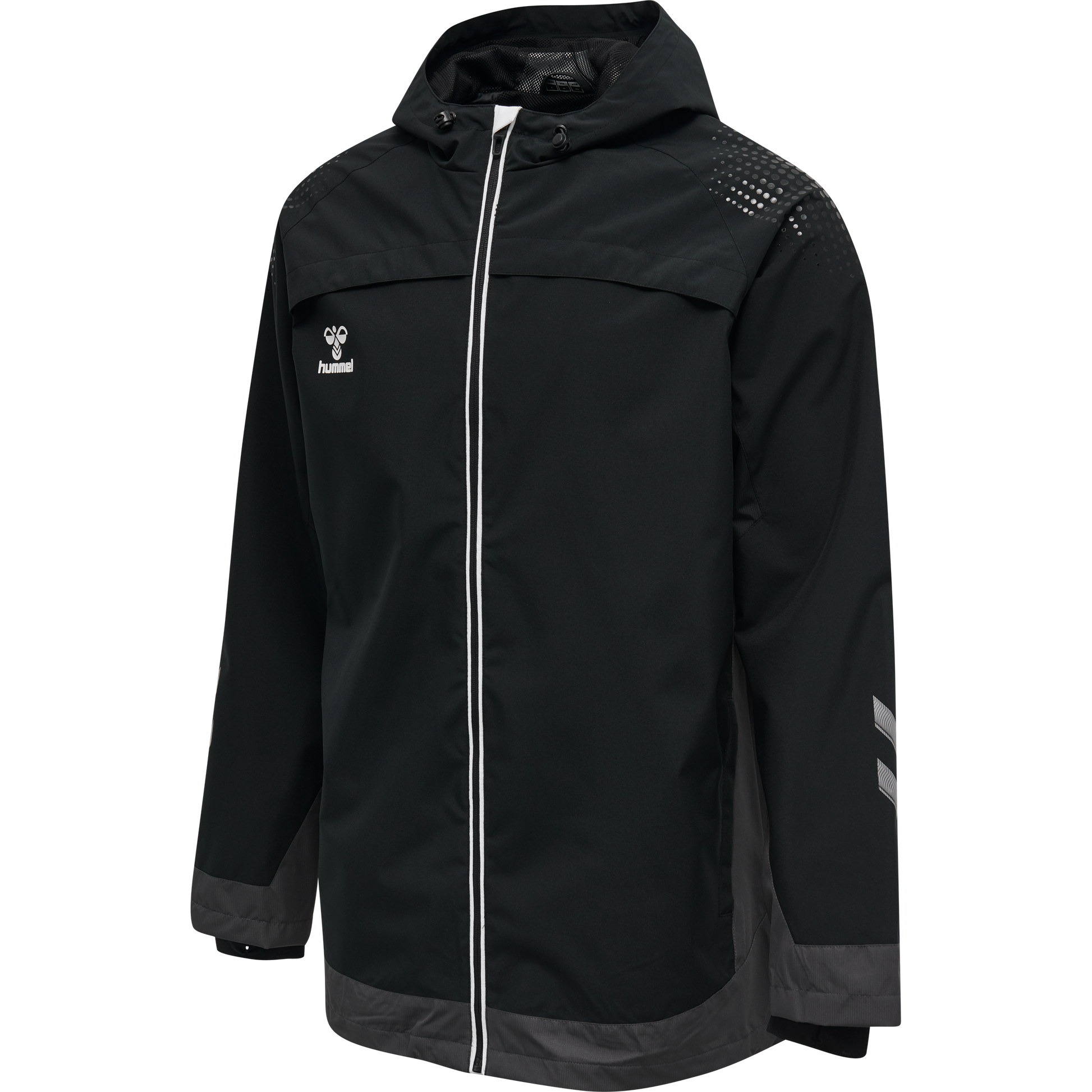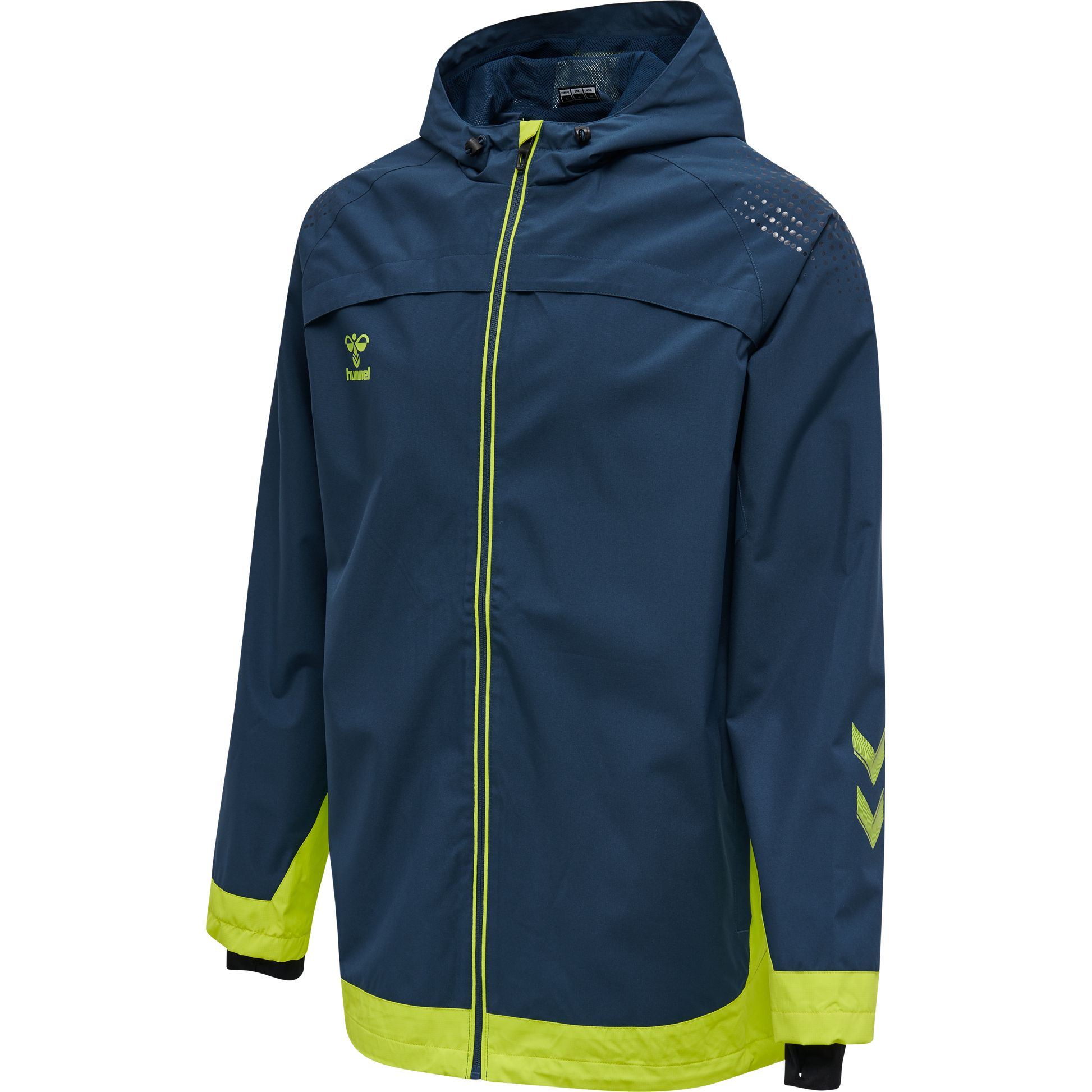The hmlLEAD ALL WEATHER JACKET is made with stretchy woven polyester that has WP3000 water repellent protection. With adjustable drawstrings and stoppers at the bottom hem and hood, this hummel® jacket can be adjusted to create a personalised fit and lock out wind and rain. The sleeves have storm cuffs with a thumb hole and ribbed inner cuffs, allowing you to pull the sleeves over the wrists for extra coverage.
