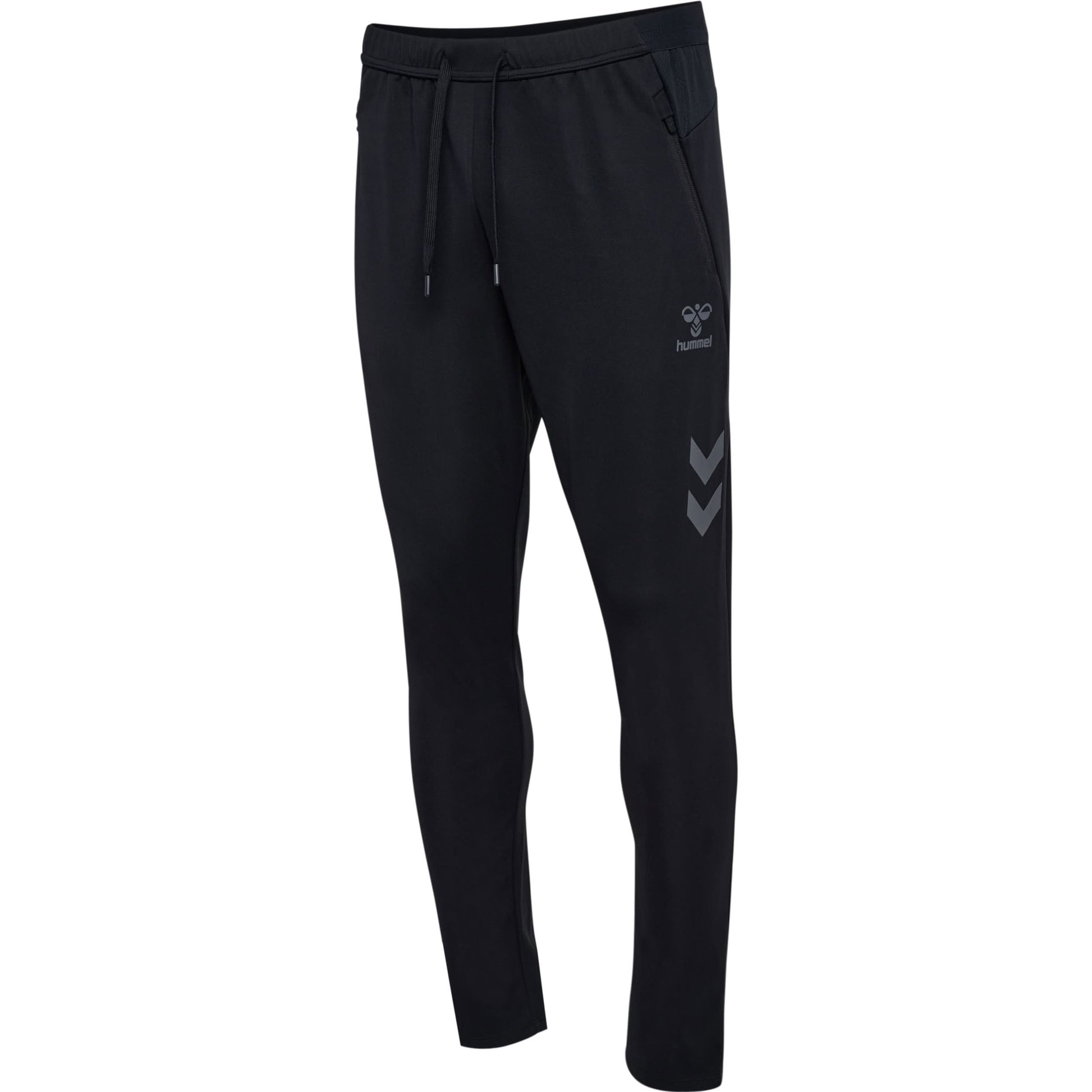 The hmlCIMA 2.0 PANTS feature a secure zipper pocket for valuables, a drawstring waist for a snug fit, and a tapered design that narrows at the ankle. The elasticated waistband ensures comfort and easy wear. A hummel logo and hummel chevrons complete the design.