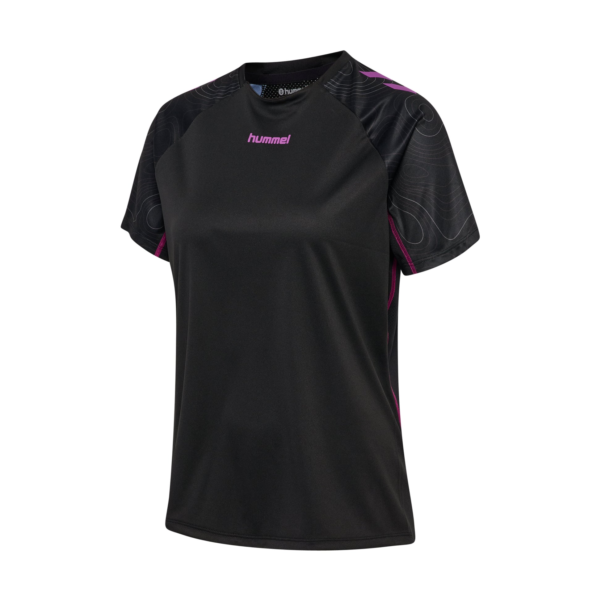 The hmlBLAZE 2.0 TRAINING JERSEY S/S WOMAN is a lightweight training jersey with a tight fit that allows great freedom of movement. The shoulders feature a decorative print and hummel chevrons for a sporty look. Built-in ventilation zones enhance comfort during activity.